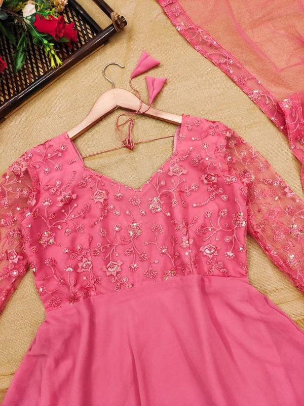 Material:- Georgette (Yok work is on the net)Complete LinningLength 52 InchFlare 3.5 mrtsSleeves 21 inches